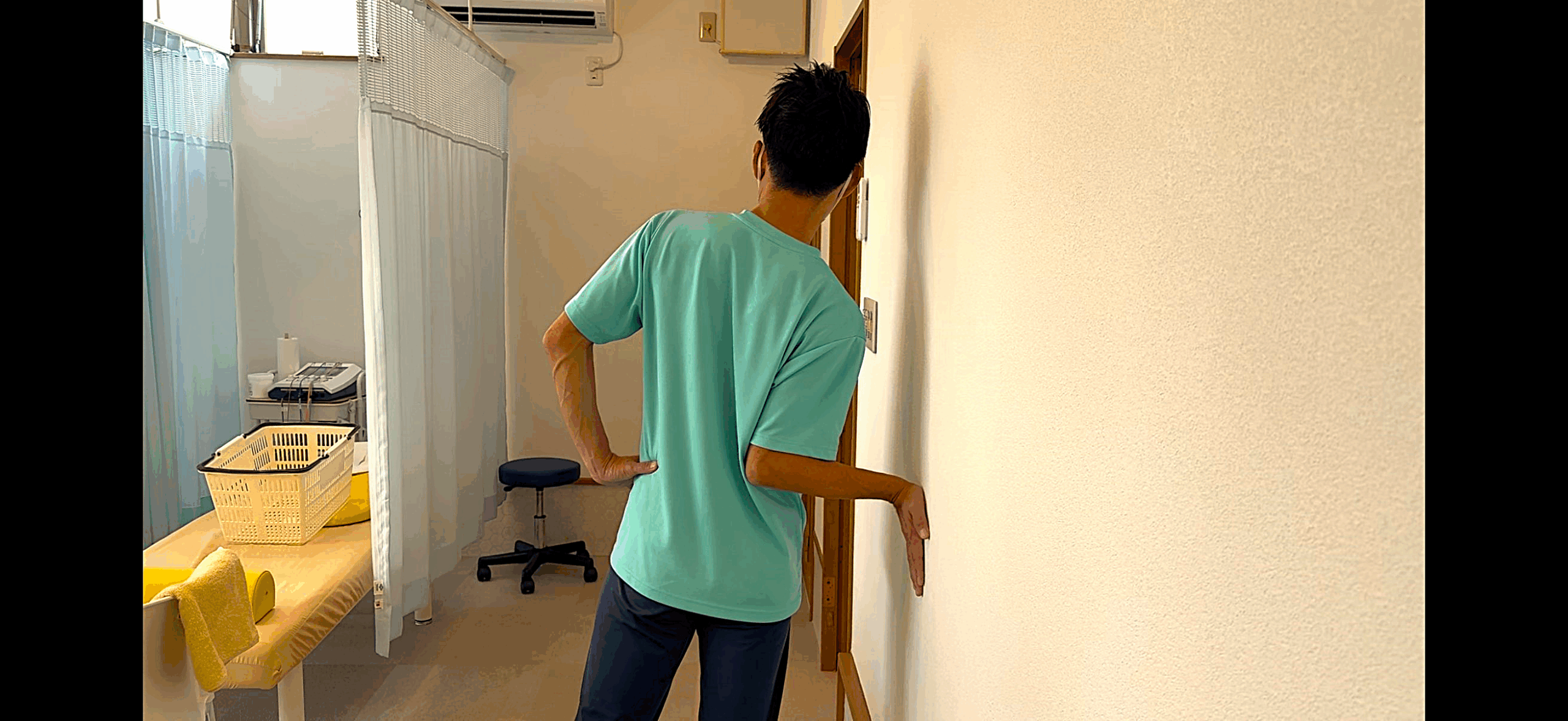 ③ 身体の軸は真っ直ぐのまま、身体全体を壁側へと倒します。