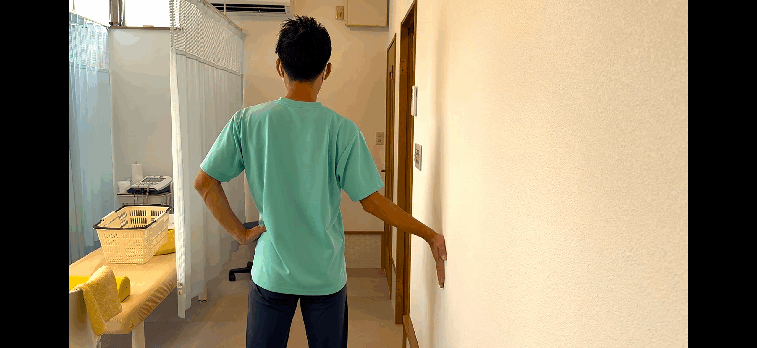 ① 壁に対して横向きに立ち、肘を軽く曲げ、指先を下に向けて、手のひら全体を壁につけます。
