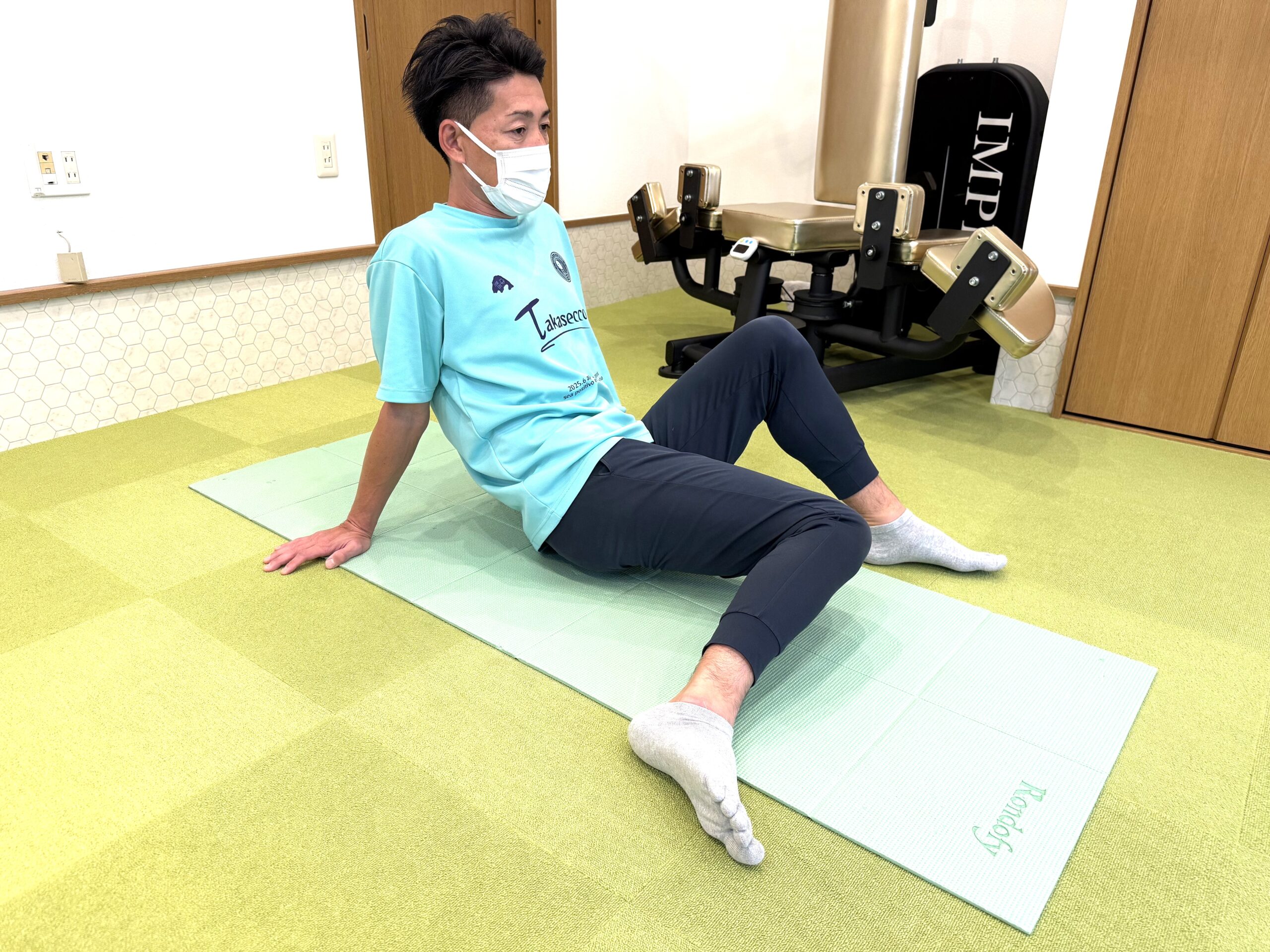 ・両手を後ろについて、膝を立てて座る。足幅は肩幅よりも広くとる。