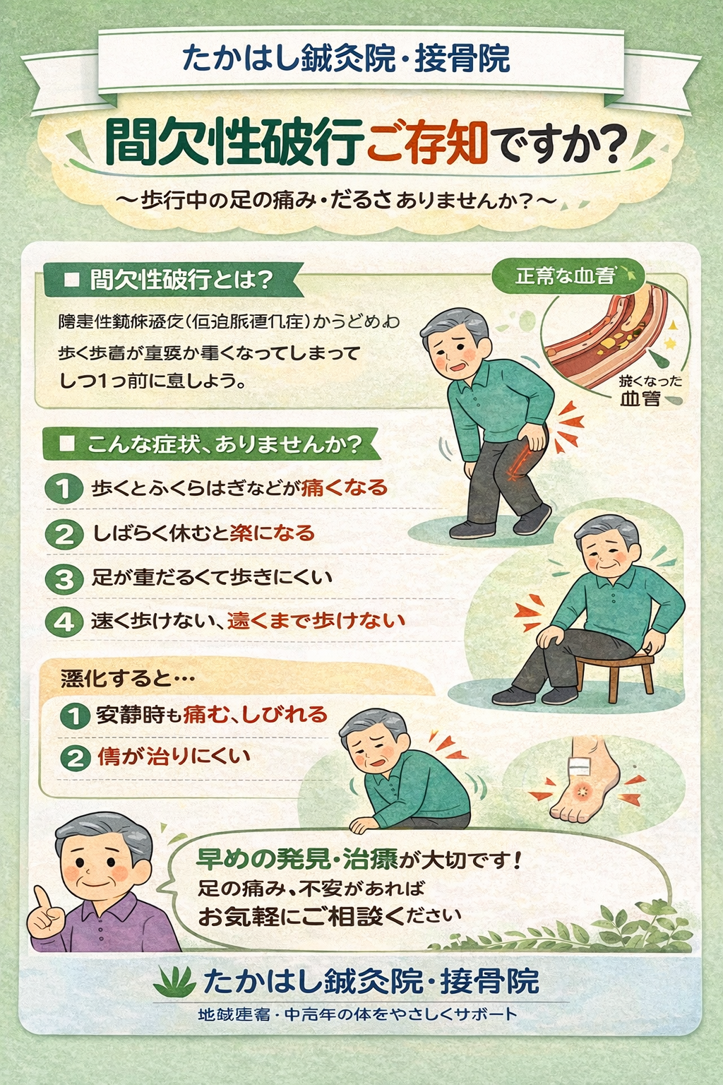 ・歩くと痛み、休むと楽になる( 間欠性跛行 )。