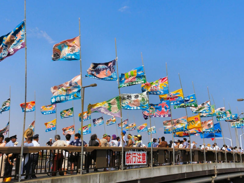 スタート地点には、大漁旗がひしめき合い多くの人で賑わいます。